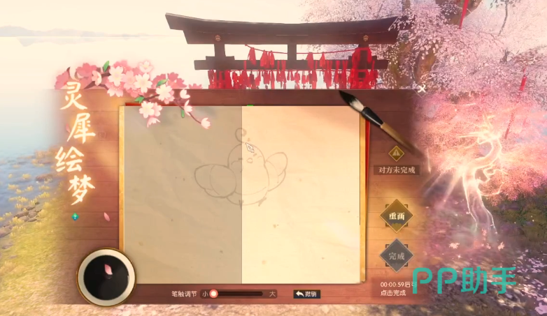 点击任务栏打开双方画布,一起在同一个画布上完成一幅画作。屏幕中有浅灰色的线稿,双方各占屏幕一半,屏幕最下方可以调节笔触大小,然后对着给出的图案描边即可。这一个绘画不用画得十分像,双方各描黑图案,系统就能判定完成。不过需要注意的是,作画时间有限定,屏幕右下方可以看到倒计时,如果超时了也可以再次点击任务重来。