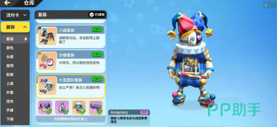 这个小丑套装由好几个部件组成,其中包括头部、脸面、手部、脚部以及衣服等组成,其中面部分为阴阳脸和大白脸两种选项,玩家可以按照自己的喜好来选择。