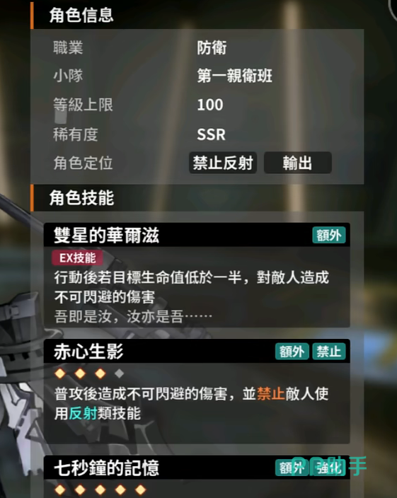 将新手十连抽完之后,苍雾残响则推出了两个池子,一个是up池,本期的up角色为——影隙微光辛西娅,作为一个六星的坦克,辛西娅的技能效果为禁止敌人的反射功能,看似是比较鸡肋的存在,但是可能在以后的某个特殊关卡会有大用处哦,毕竟这可是一个ssr角色的技能。同时辛西娅作为一名六星的坦克,她也有着出色的身板,击杀敌人时还可以提升自己的攻击力,这样在保证了一定的肉度的前提下可以具有不俗的输出,算得上是一名出色的坦克,有喜欢辛西娅的玩家们可以尝试去这个up池进行抽取,出金的概率还是很高的哦!