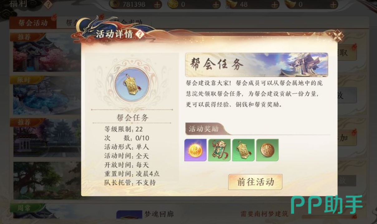 玩家随机加入一个帮派,之后在帮派活动页面当中就能够看到能够领取的各项福利了。其中包括帮派任务以及寒玉谷,还有纳贡祈福、群雄争霸,加上各种帮派活动。玩家只需要参与帮派,完成这些任务操作之后,都能够领到由帮派带来的各项福利。