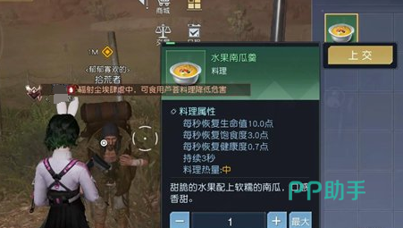 2、藏宝图获取方式:想要获得这一个藏宝图也是比较简单的,玩家除了要了解坐标位置之外,还需要了解,具体的获得方式,我们可以来到纪念碑谷,一直向左走,走到路边上,看到拾荒者触发NPC之后,就可以看到对话。通过对话可以了解到对方想要水果南瓜羹,将提前准备好的南瓜羹交给对方,就可以获得藏宝图。