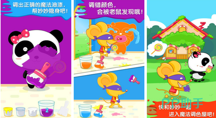 这是款给宝宝玩的填色题材游戏,小宝宝们玩这款游戏可以认知很多颜色,在游戏中小宝宝们会化身为粉刷匠,可以用可爱的小刷子粉刷墙壁,各种颜色的颜料随便你使用。游戏中还有个隐身的玩法非常有意思,你可以在小熊猫的身上涂满颜料,让小熊猫跟周围的景色融为一体,避免被小老鼠找到,小宝宝们会很喜欢这款填色游戏的。