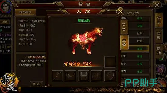 1、帝王御马图鉴:这个坐骑是大家在做主线任务时会碰得到的,只不过它是体验型的。一般获得后使用只有三天的时间,具有提高物攻以及物防等特性。