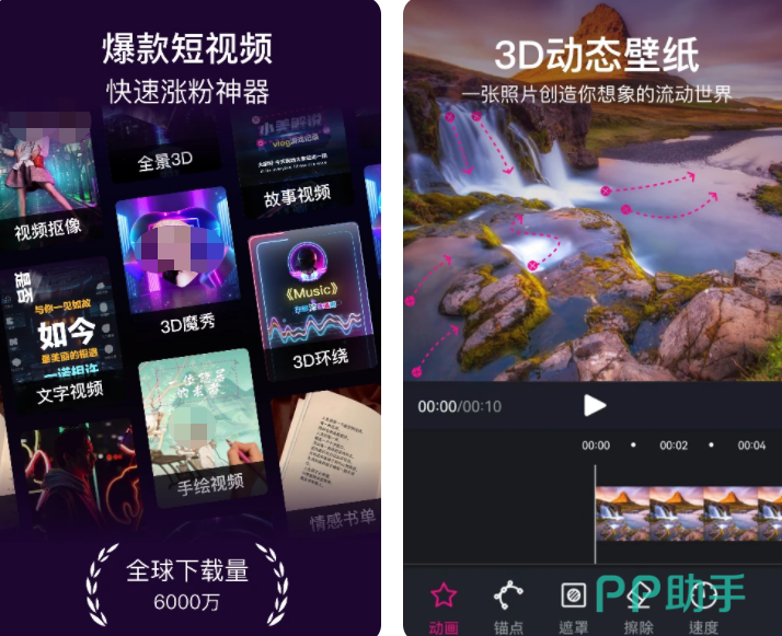 这款软件有特色图片转动态功能,上传手绘图片,添加描点、遮罩擦除以及调速,可以让一张图片流动起来,做成动画。还有很多特效拉满的绚丽字幕动画,跳动音符、转场动画帮你节省许多画关键帧的步骤。