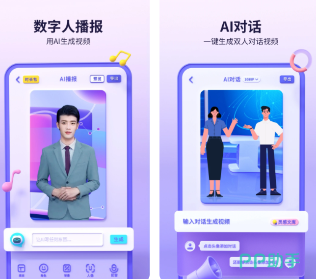 这个软件里面有大量动漫角色素材,使用AI生成视频,在对话框输入双人对话内容,调整好动漫角色摆放位置,能智能生成配音,用户可以调整多种场景搭配、服装穿搭以及角色的语音语调,还有海量卡通图标素材库,充分展示你的创意。