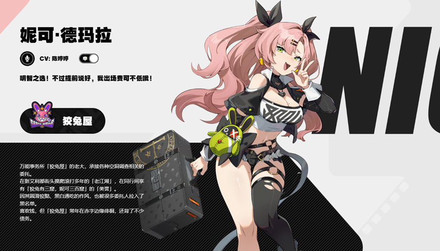绝区零妮可德玛拉这一个角色设定是什么?妮可组织狡兔屋的伙伴们承接空洞调查相关的委托任务,在前期的主线任务也是指引玩家的引路人,除此之外妮可本人作为老大也是有着十分丰富的江湖经验,在同行都用“狡兔有三窟,妮可三百窟”来形容妮可,妮可虽然流连与黑白道之间收集任务赚取佣金,但是狡兔屋依然是有不少债务。