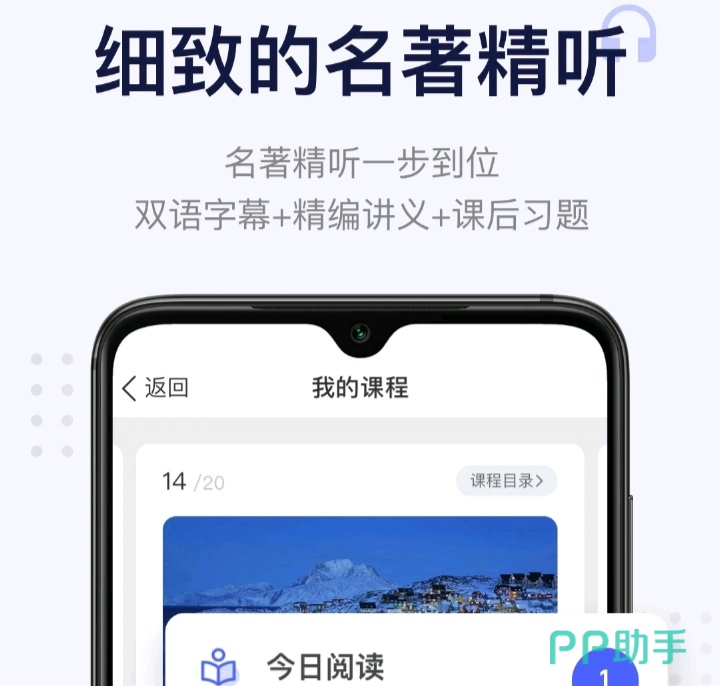 每天都会上新配有双语字幕和原声朗读的名家讲话、各类名著、经典小说,让你获得地地道道的英语阅读体验;专业的英语外教通过逐字精讲,教你发出正确的英语朗读声;每日练习和答案讲解,让你及时检验出实际的学习效果。
