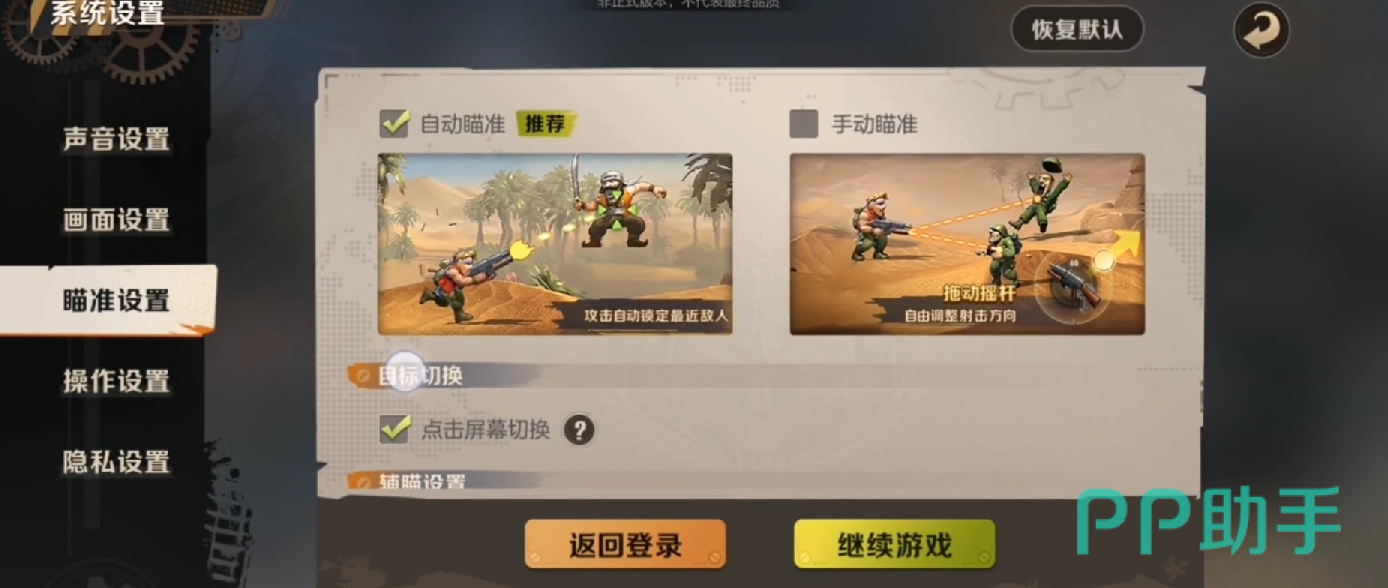 此外,对于操作方面,毕竟其前作便是一个半操作类型的游戏,对于玩家的技术要求比较高,所以在面对一些较难关卡的时候,建议玩家们去设置界面,调一下自己的瞄准模式。游戏目前有两种瞄准模式,分别为自动瞄准和摇杆瞄准。前者下限高易操作,后者的话能更容易打出一些高难操作,这得看玩家们自己选择。反正建议前期新手玩家们用自动瞄准即可,后期如果有了更高的操作水平,那么可以试试摇杆。