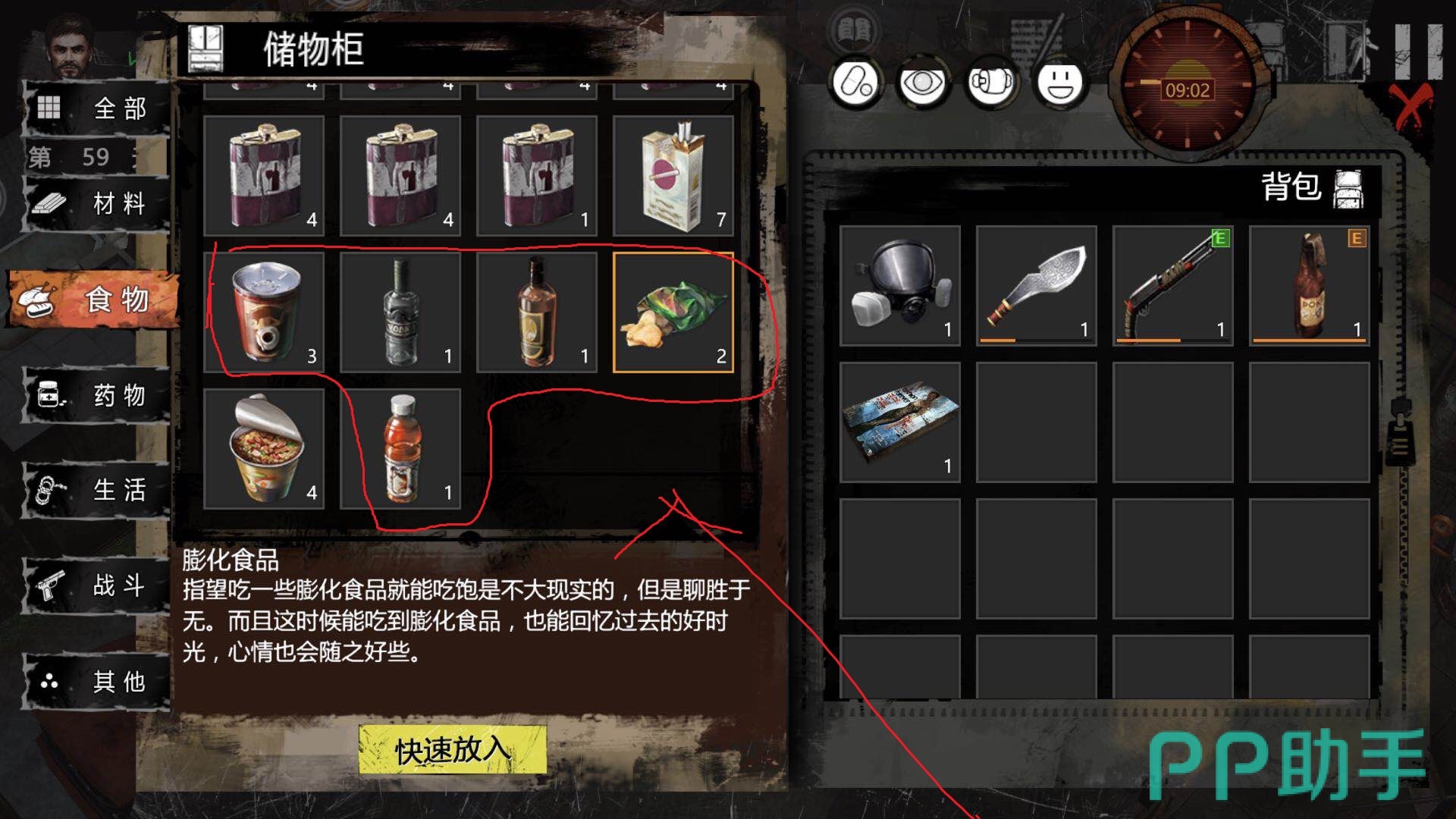 第五个方法:喝酒或者吃一些增加心情的十分,游戏中常见的有心情类食物有可乐、咖啡、膨化食品,像这类食物也不会过期,十分适合当玩家的必备口粮。