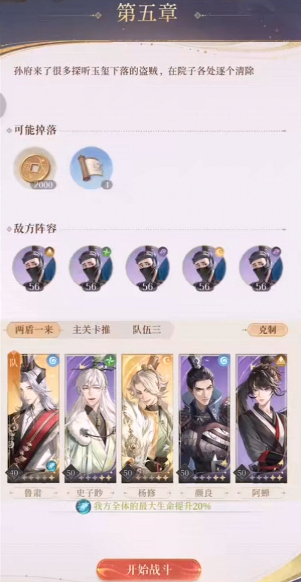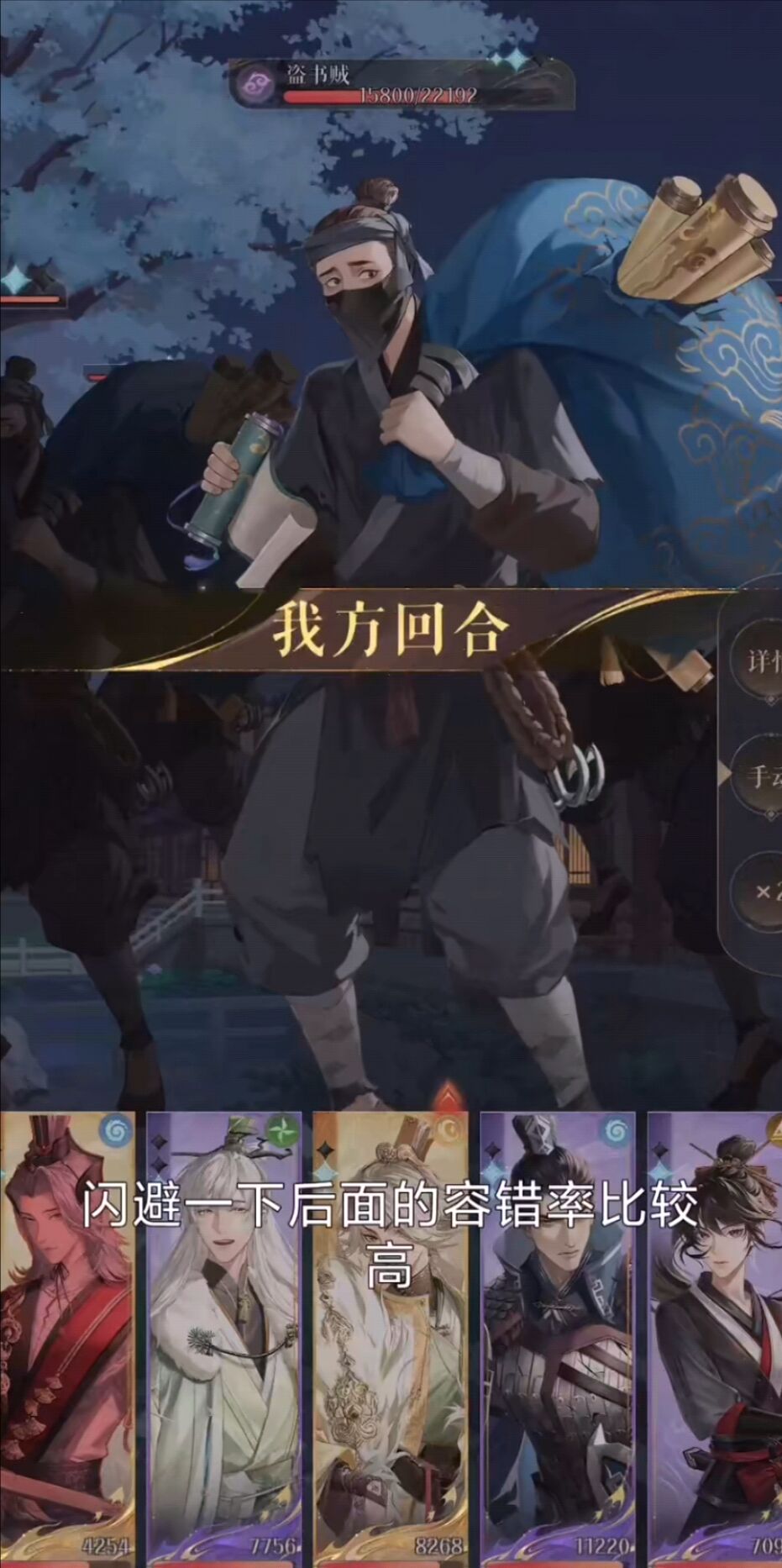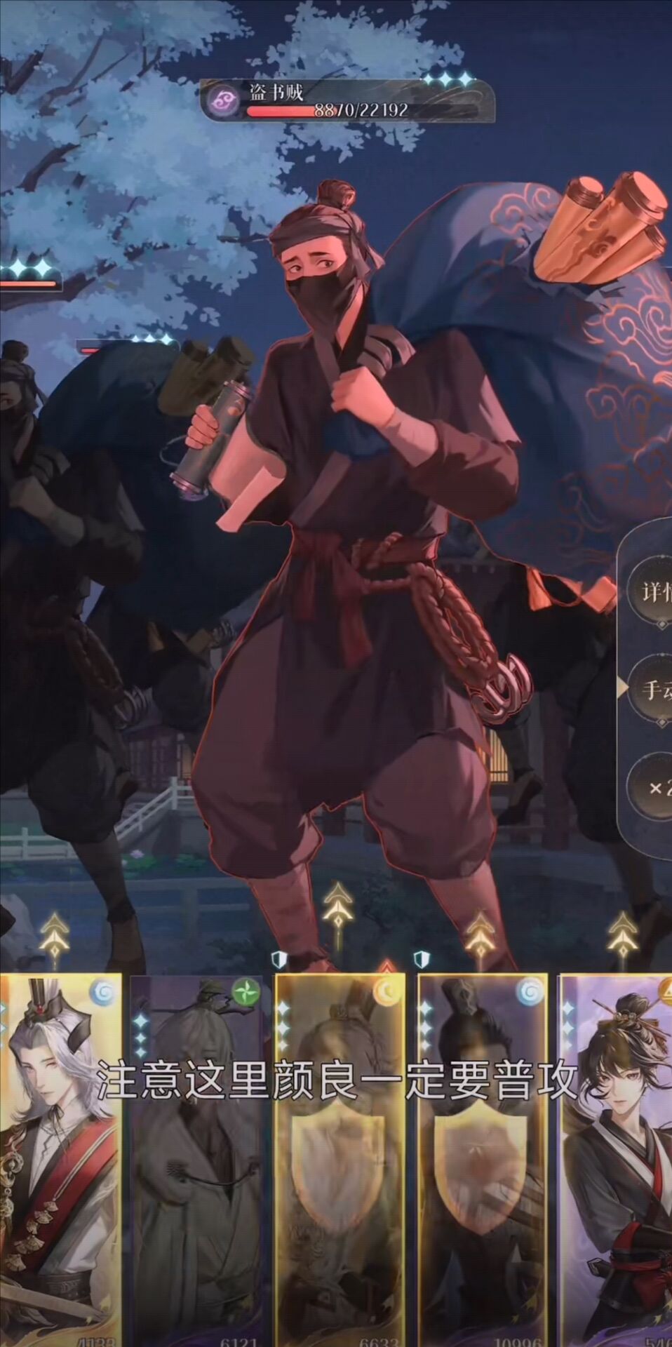 小编选择的阵容为鲁肃、史子眇、杨修、颜良、阿婵,由鲁肃作为队长。开局阶段可供玩家操作的空间还是比较少的,只需要正常打即可,首先上场的盗书贼为阴属性的,我们要做的就是集火他,然后史子眇防御一下,第一轮的伤害并不足以将其杀掉,但不急,我们还有阿婵。轮到盗书贼攻击时最好使用一下阿婵的闪避,以确保阿婵能够存活下来为我们收割残血。第二轮攻击仍然是颜良嘲讽盗书贼,史子眇使用一下加血技能帮助队伍恢复状态,其他全员使用普通攻击来积攒能量。