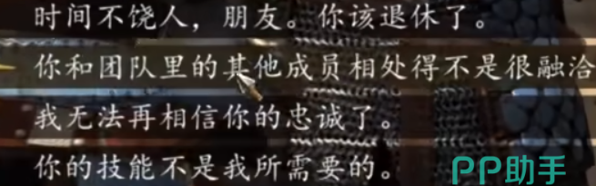 继续选择第一个“我不再需要”你的效忠了,然后会弹出你遣散他的理由,不同的选项对于不同的NPC效果也不一样,最稳妥的方式就是选择委婉一点的说法,对于年纪大的角色选择让他退休比较好,对于年轻人可以选别的。