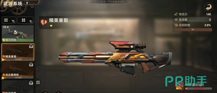 8、精英重狙击:这款武器的特点就是其可以无视防御,随着武器等级的提高,这款武器可以从2%的无视防御逐步提升,给敌人造成更大的伤害。