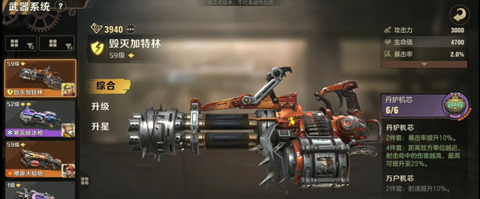 6、毁灭加特林:这款武器是一款攻击高、暴击率十分不错的一款重型武器,尤其是在搭配丹炉机芯后可以将其暴击率提升10%和伤害提升25%,在对战时往往是可以作为大规模杀伤的一款武器。