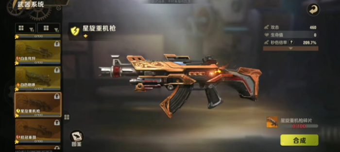 3、星旋重机枪:这款武器作为机枪其重量不大,较为便捷,并且有着相对不错的攻击力和射速,是一款灵活度相对优秀的武器。玩家可以用这款武器在敌方阵营中上演一出三进三出的震撼场面,想必游戏体验一定极佳。这款武器也有缺陷之处,便是其攻击范围较小,玩家无法用其对远处敌人进行攻击,稍稍有所局限性。