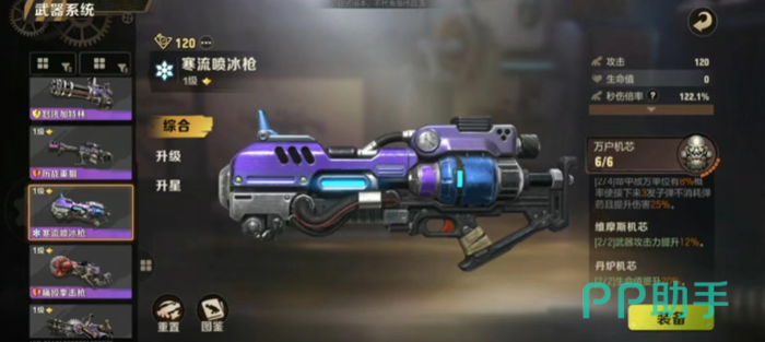 1、寒流喷冰枪:这款武器是一款攻击高达120的重型武器,秒伤倍率可达到122.1%,杀伤力极大,并且玩家还可以配置机芯——维摩斯机芯、丹炉机芯等,为武器增加攻击。
