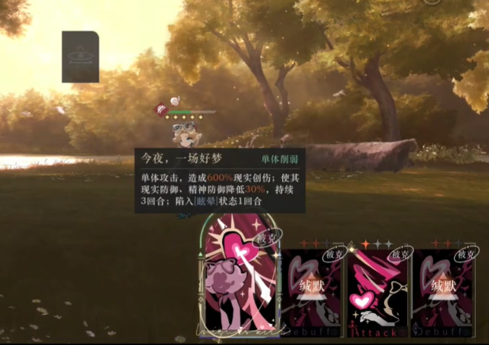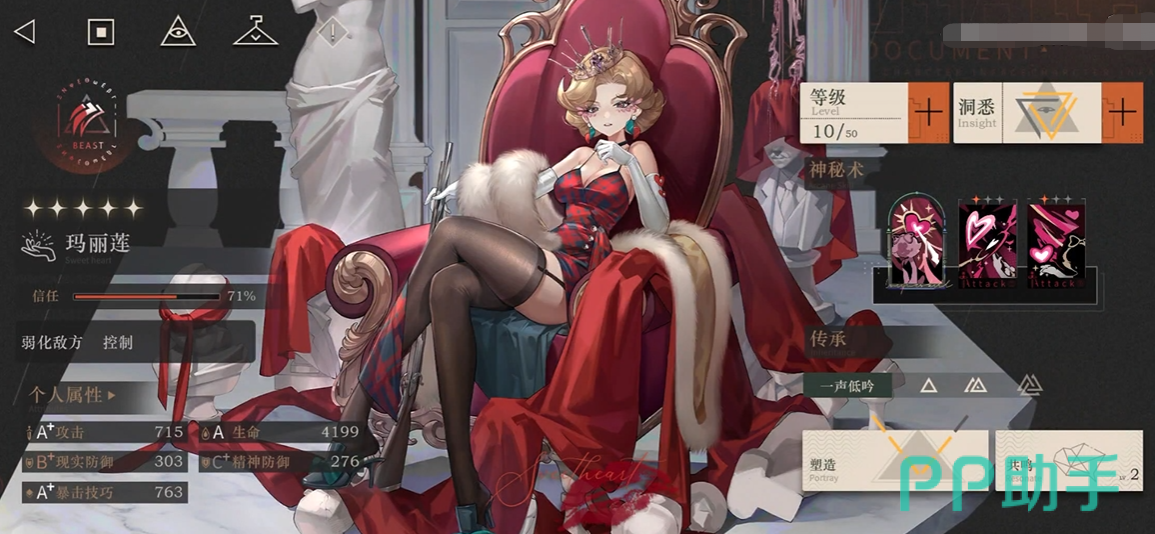 最后一个技能也是一个单体攻击的技能,这个技能目前也是玛丽莲最高伤害的技能,使用的死后可以造成的现实伤害有400%,这个百分比在输出角色里面还是比较高了,而且在带来伤害的同时,大家可以在上面减少20%的防御,不管是现实还是精神层马可能的防御都有哦,最后就是可以一个回合中受到眩晕的影响。