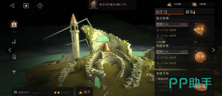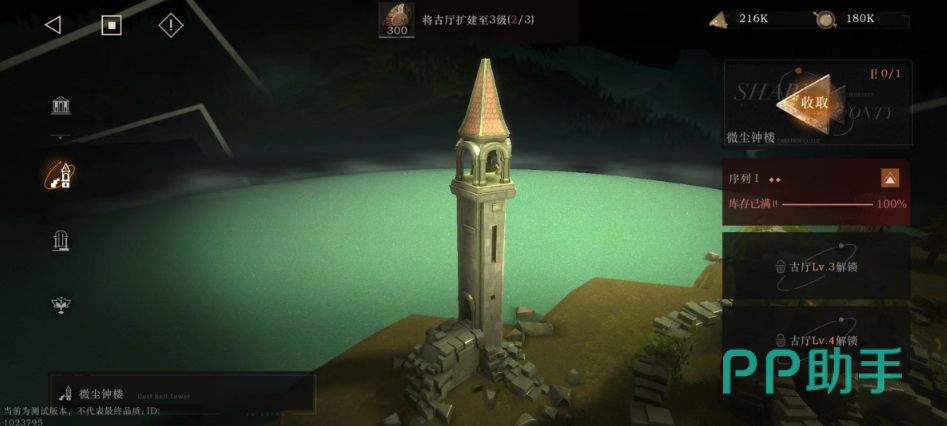微尘钟楼,如果说上述的是产生利齿的话,那么这个便会生产微尘。其造型是一个破旧的钟楼,在整个家园当中,都属于高度最高那一级别的地标性建筑物。玩家们可以在这里按照规定的时间获取一定的微尘资源,用于角色升级养成。同样的也会随着古厅等级的提升,其资源获取量也会额外提升。