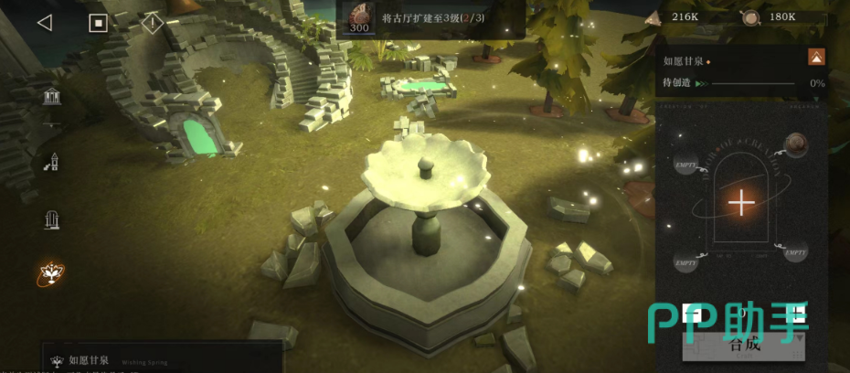 如愿甘泉,其造型就是一个破旧的喷泉。但其貌不扬的外表下,却是游戏中最重要的升级应用工具。在玩家们通过升级骨厅解锁之后,即可以在这里消耗低阶资源,升级获得高阶资源。通常情况下,角色除了一些基础资源升级以外,还需要相应的升级材料进行洞悉突破。那么,这个喷泉的主要作用就是为了让玩家们通过该喷泉将一些较为容易刷取的低阶资源升级,打造成需要使用的高阶资源。就类似于一个工作台性质,能帮助玩家们更好的对角色养成和使用,且不会随着古厅的升级而额外获得进化,一旦解锁功能,就可以立即使用。