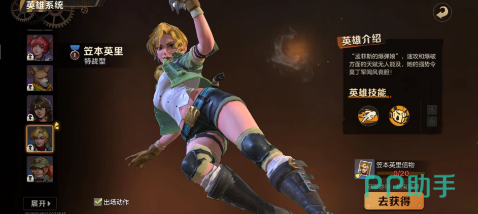 笠本英里,普通技能是麻雀冲锋,按一下英里向前冲刺攻击敌人。短时间内可再次使用,她会向后方跳跃,空中向目标方向扔出5颗爆裂手雷,重复命中每颗伤害减半。被动是全队英雄灼烧增伤属性提升,没5%的暴击率提高1%。大招是爆裂炼狱桶,投掷燃料桶产生大范围爆炸,直接造成大量伤害,随后生成熔岩区域,间隔性造成伤害,且区域内的英雄获得异常增伤属性。