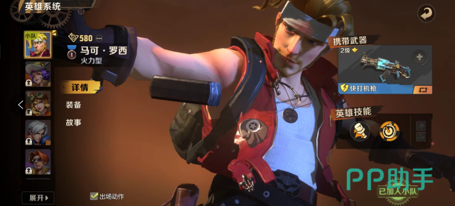 第一个小编要介绍的是马克罗西,他是每一位新手玩家最先获得的英雄之一,继承了合金弹头的经典形象,机制简单,适合每一位新手玩家上手使用。技能可以最多扔三次手雷,可以造成高贵的群伤,并且击退面前的敌人。“子弹时间”特殊技能能够让自己手持双枪,十分炫酷,攻击的速度和伤害都会大幅度提升,是一位非常优秀的火力型英雄。