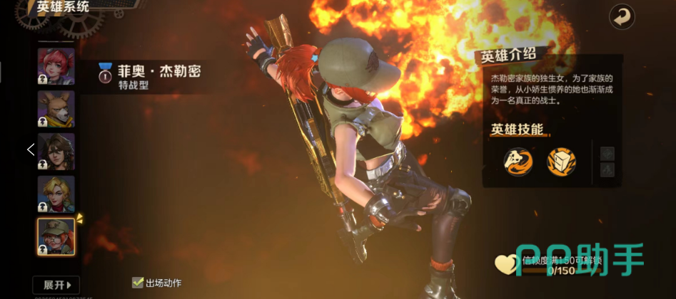 菲奥杰勒密,她的技能是毛绒熊暴,拿着玩偶熊向前突击,最后一下可击飞敌人。如果跳起来,则会变成持续旋转下落攻击。被动是全队英雄重伤增伤属性提升,每5%无视防御属性提升1%。大招是天降冰箱雨,从天而降打击敌人,多个冰箱爆炸后掉落食物,拾取后可以提升移速3%一共5层(可继承),此技能适合打boss。