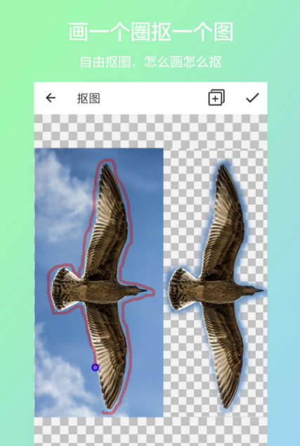 软件的体积非常的小,但是功能却很丰富,小小的一个圈圈就可以帮助你快速的完成抠图,更有魔法一键抠图的完美操作等你来体验。如果遇见印章的边缘不是那么精准恶情况你是可以选择玉华模糊处理功能哦,这样就可以让素材看起来更加的自然贴切,自定义的角度跟边框为你打造不同的图形,给你想要的一切抠图需求。