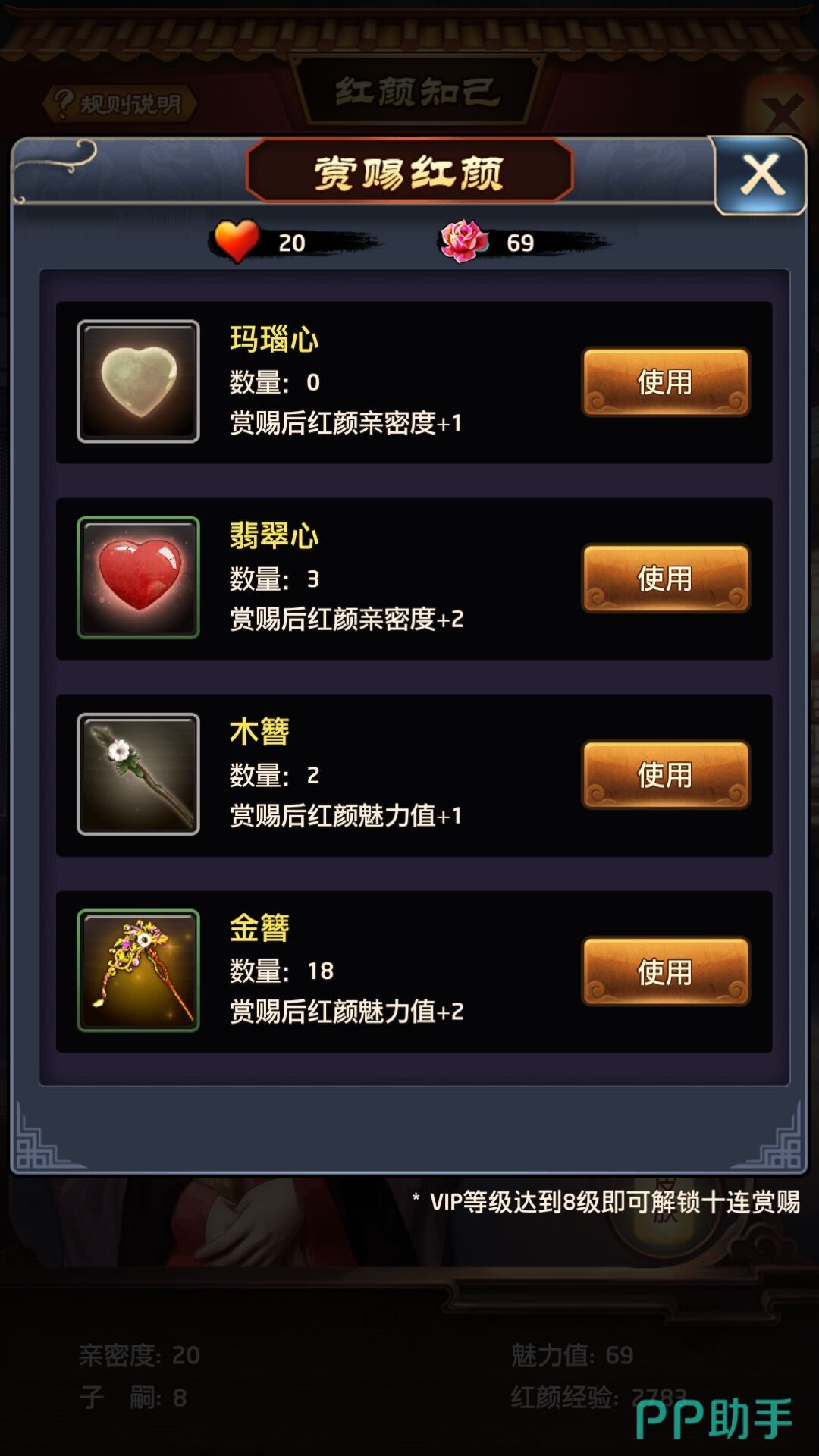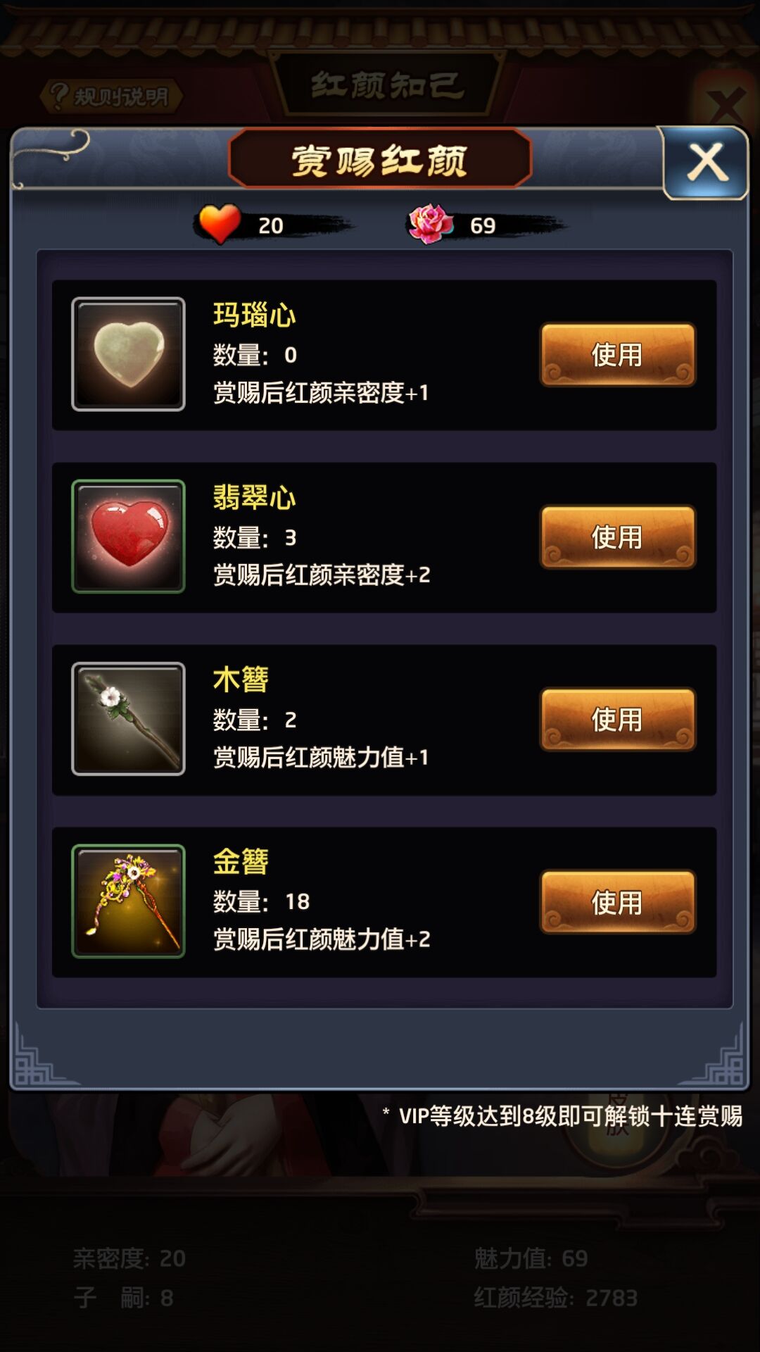 红颜的亲密度决定着子嗣的品质,很可能会出现“神童”这种天资极高的儿女,V1玩家可以采用问候红颜的方式,每次可获得一点亲密度,或者通过赏赐的手段,使用游戏过程中玩家获得的玛瑙心或翡翠心来提升红颜的亲密度即可。而魅力值越高,红颜获得的红颜经验奖励就会越高,魅力值的增长方式主要是通过赏赐,使用木簪或金簪即可,这些物品也是很容易得到的。V1玩家的红颜培养的道路,便可以借此作参考!
