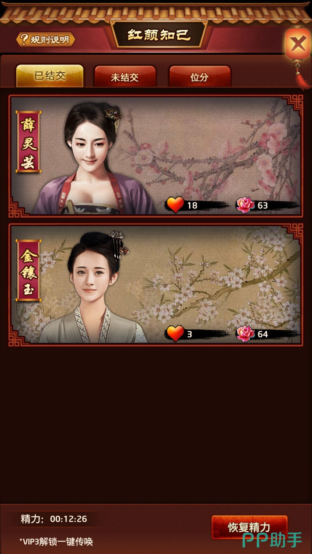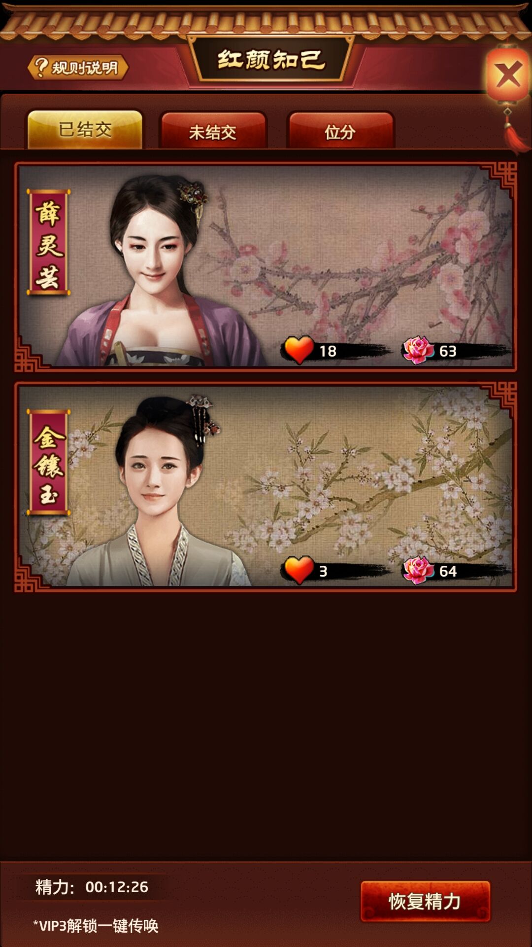 其一,不要拥有太多红颜。V1玩家如果想要培养出一位优秀的红颜,最好的办法就是将资源集中起来给一位。尽量不要在游戏中去获得更多的红颜角色,因为如果玩家只拥有以为红颜,那么每次的宠幸对象只有其一人,而当红颜数量超过一人,玩家的宠幸将会随机分配,这就导致培养目标的红颜经验增长缓慢,直接影响了红颜的培养。所以玩家一定要少去寻访,避免获得太多红颜,对于资源并不十分富裕V1玩家,这点很重要!