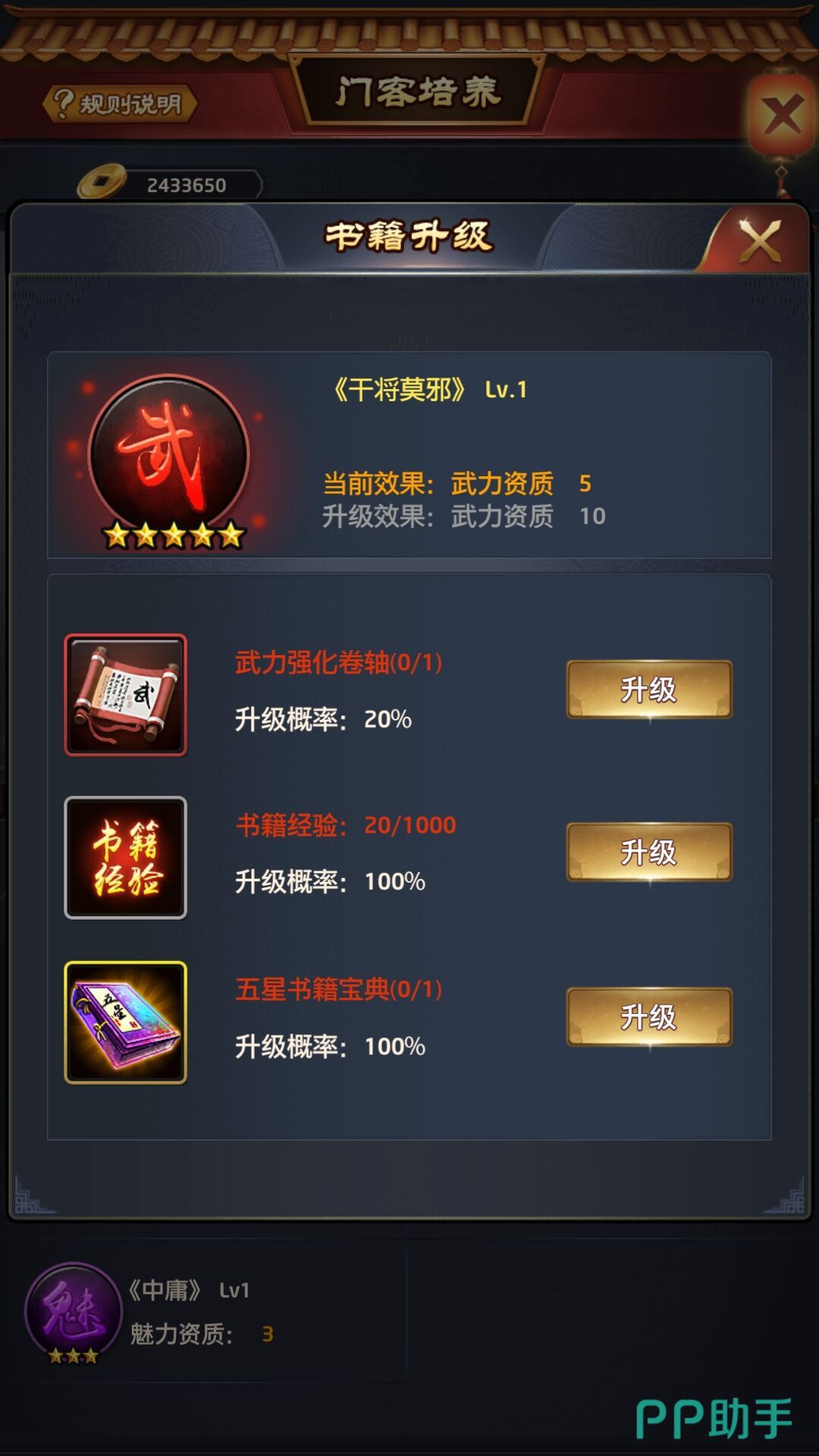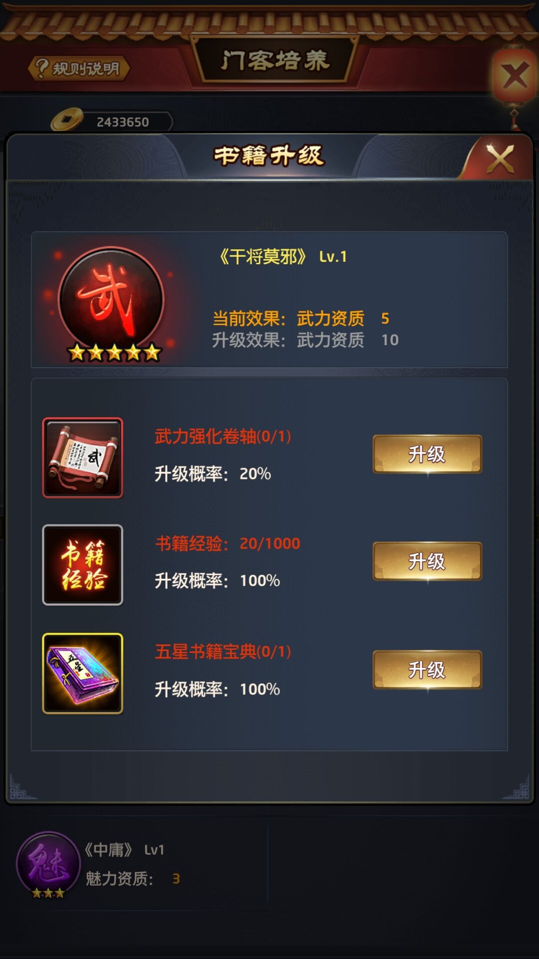 其次还推荐V1玩家培养红颜“金镶玉”,该角色的获得并不麻烦,只要玩家势力达到五万即可获得,培养她的原因在于,她的红颜技能针对的门客为干将,作为武力资质优越的门客之一,玩家在官居八品左右便可获得,高级别的干将用来通关或讨伐都是很出色的。很值得玩家去培养的,而金镶玉的第一个红颜技能便可以极大的提升干将的武力属性,如虎添翼,相辅相成。