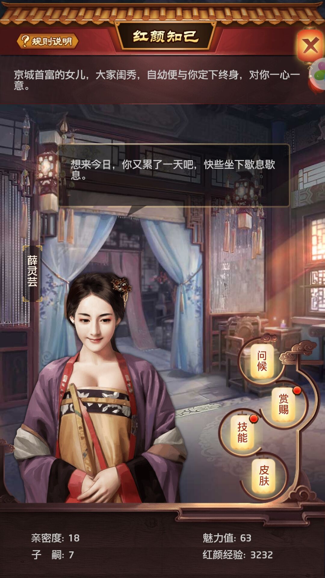 其二,选择恰当的红颜培养人选,玩家在刚接触游戏时,会遇到自己的第一位红颜“薛凌芸”,。薛凌芸作为新手必备,资质一般,但随着玩家对其逐渐培养,亲密度也会相对提高,当亲密度达到二十时,便会解锁红颜技能,薛凌芸的技能是对初始门客“华安”的加成,华安由于从玩家刚接触游戏开始,便会跟随着玩家,作为资质均衡的门客,在亲期的游戏中起着很大的作用。所以培养薛凌芸,是个不错的选择。