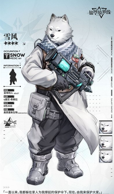 在银河境界线中雪风是一只非常可爱的高大狗狗,他是类似兽人的一种存在,在游戏中是一名四星输出战士,拥有不俗的攻击力和生命力,雪风的技能可以为队友全体治疗回血,加大了队伍的存活率。