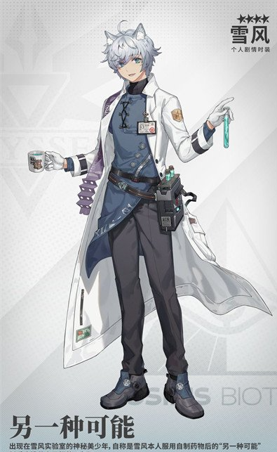 在游戏中,雪风还有一款独家皮肤,在皮肤立绘中雪风会变成人形态,这是为什么呢?因为雪风给自己研发了暂时变成人类的药剂,他认为科技能够改变一切,所以毫不顾忌地服下了药剂,变成了一个可爱的美少年形态,大家如果喜欢这款皮肤,也可以在游戏剧情中获取哦!