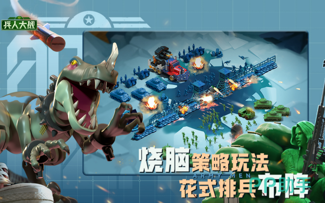 这款机械恐龙游戏给大家呈现了一个微观世界,因为游戏里的战斗单位都是小小的兵人玩具,游戏里的机械恐龙也是一个小玩具,你会成为兵人军团中的最高指挥者,需要派遣兵人军团与各种各样的玩具交战,利用玩具坦克和玩具飞机摧毁其他兵人的堡垒。本款游戏以独特的微观视角闻名于世,操控玩具们战斗的快感也很独特!