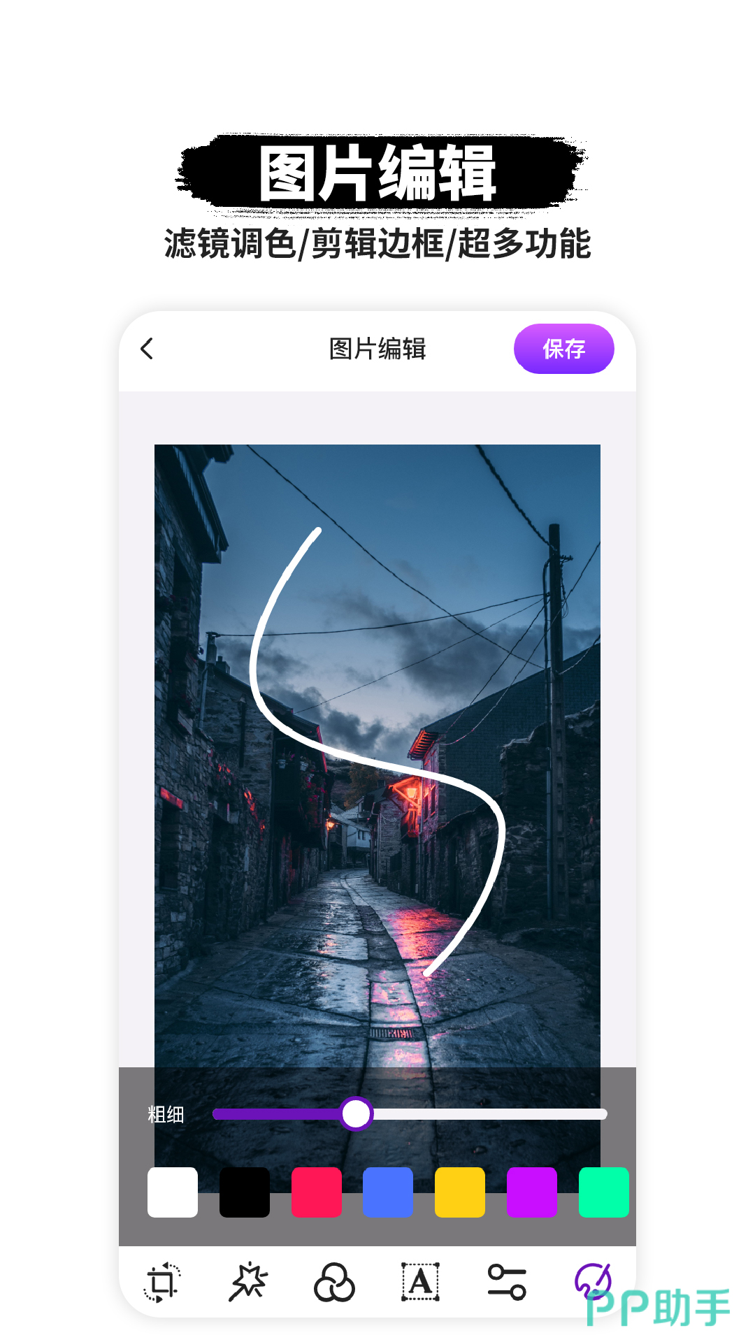 图片编辑就是一个可以随时对图片内容进行更改删减,扣除或添加贴纸元素的工具,用户可以利用这款软件来调整图片的滤镜,使其有其他不同的颜色,也可以选择软件自带的贴纸或边框,为图片添加更多的元素。