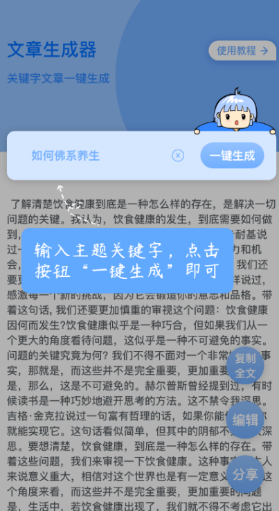 在文章生成器app中,大家可以选择指定的主题进行一键生成,能为玩家在编辑文本,创建各种表格时节省不少时间。这款软件可以设置Word转PDF,Excel转PDF,多种功能等待大家来解锁,当小伙伴们认为某一个文案特别好时,可以点击文本复制进行分享好友,选择好的文本留给最主要的人。