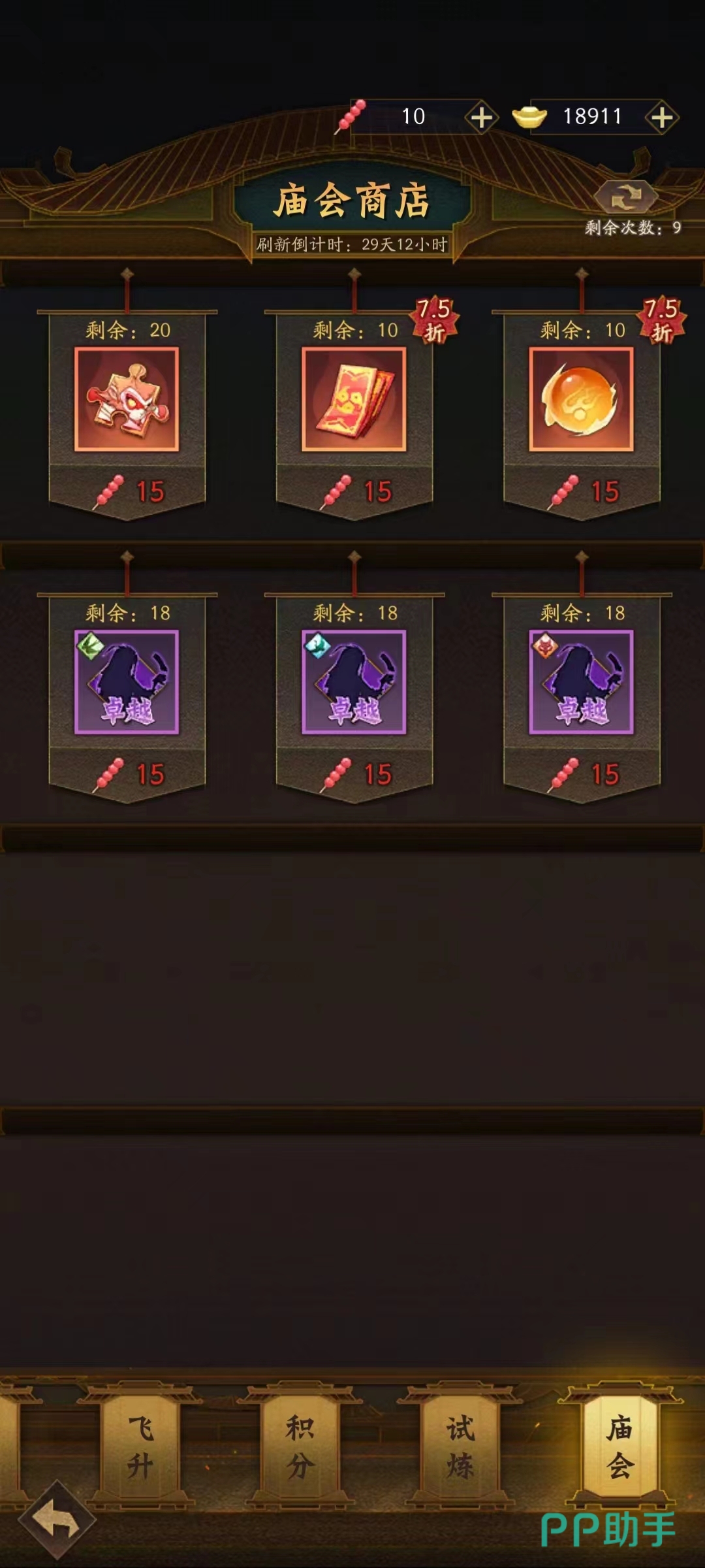 点击下方的商店,就能够在庙会商店中使用糖葫芦兑换这些资源了,其中最珍贵的莫过于斗战胜佛的碎片以及种族召唤券还有飞升灵珠,这三个道具能拉满就直接拉满,毕竟两个是获得神魔系的道具,另一个是获得指定种族的道具,都是非常稀有的。