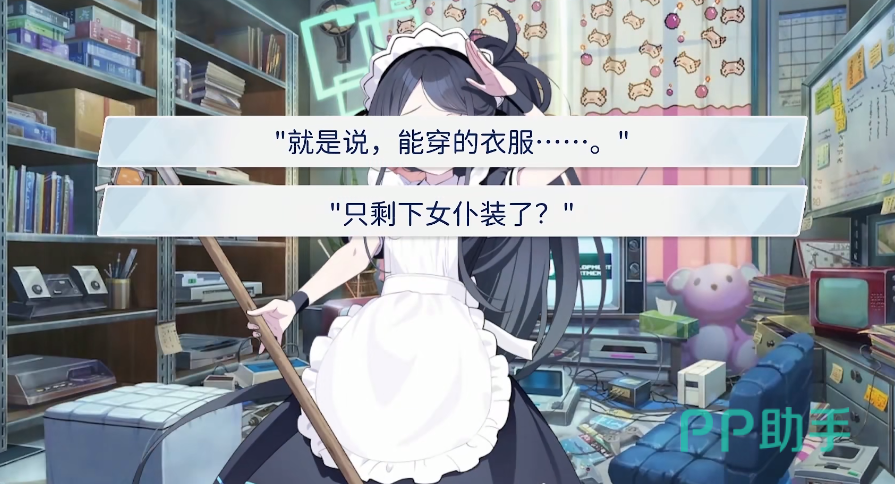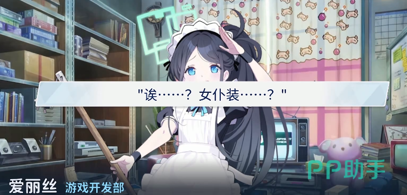 故事一开始,就是在游戏开发部中,爱丽丝其实是想要过去打扫卫生的,但是苦于没有合适的衣服,所以一直都不想现身,这个时候就有老师问,到底是有什么需要帮忙的,它很尴尬的告诉老师只有女仆装。