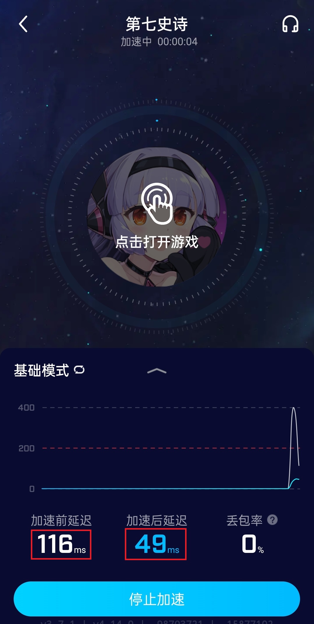 当你安装完毕后手机桌面上会出现游戏图标,这时候我们返回biubiu加速器,在首页最左侧加速一栏或者最右侧我的游戏中就可以看到这款游戏,点击“加速”,软件就会自动为你寻找最合适的节点,加速前后的效果也会显示在界面上,例如这里加速前有116ms的延迟,加速后只有49ms了,在我们能接受的区间之内。