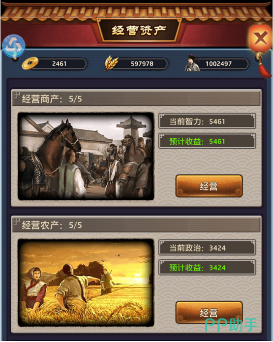 点击门客华安后进入经营资产界面,经营资产中可以获得银两,粮食,士兵。