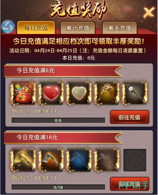 在充值奖励中可以根据充值的档次获得丰厚奖励,奖励中包括大丰收的道具。档次越高,所获得的奖励道具越多。