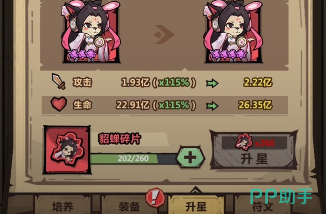 给狗将升星的确是挺费劲的,越到后期所需要的碎片数量会越多,可以说是成倍增长,这对于平民玩家来说是挺不友好的,不过当狗将的星级升至皇冠阶段之后,它就可以开始获得新的皮肤了,此外,从该星级开始,每升两星就能选择一个技能进行觉醒,觉醒后的技能强度会大幅度提升哟~