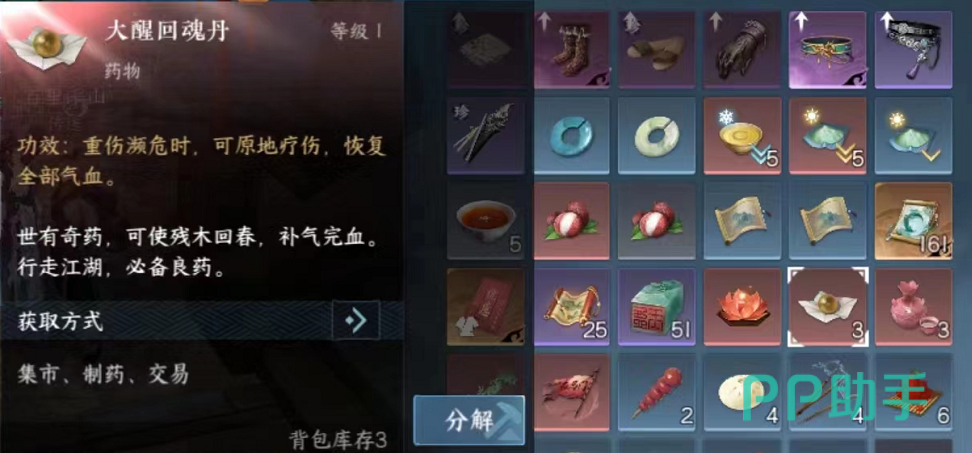 目前游戏内的回魂丹一共分为三种品质,大回魂丹,中回魂丹以及小回魂丹。其恢复的气血数值是逐层递减的。最值得获取的还是大回魂丹,最多可以帮助我们恢复满气血状态。目前游戏内获取这个回魂丹的方法有三种,首先第一种就是完成战斗,游戏内有很多的战斗任务,一些副本的话也是会有回魂丹的奖励,不过副本难度越高,我们能够获取的回魂丹品质就会越高,玩家们也要根据自己的实力去酌情挑战。