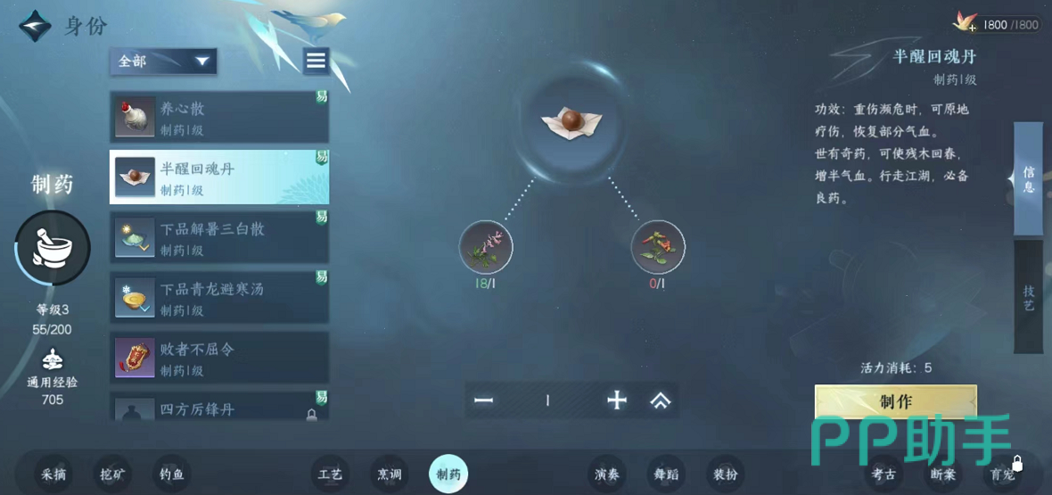 最后,玩家们也可以通过制药的方式获取回魂丹,很多玩家通过制药也能快速发家致富,我们在身份界面选择制药板块,玩家们直接点击回魂丹,通过集齐对应的材料即可一键完成制作。