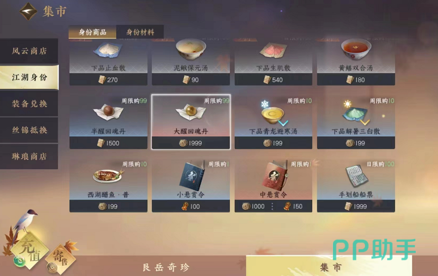 第二种方法,玩家们可以通过购买获取,直接进入集市界面,在这里会有大量的商品出售,其中回魂丹使用交子就能进行购买,在江湖身份里选择身份商品,其中就会有两种回魂丹的存在。