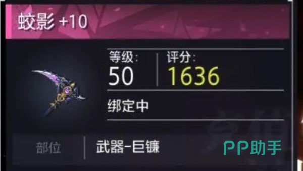 武器名为蛟影,是一把巨镰,当等级达到50级的时候,它评分已经达到了1636,物理攻击直接达到580,力量达到了261,体质达到了261,敏捷达到了174,强化属性里面的破防物攻为442,破防魔攻442,附加属性将它的物理暴击率增加4%,魔法暴击率增加4%。