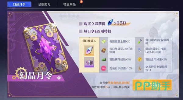 要是经济宽裕一点的,还可以将月卡给购买一下,它里面分为两种,一个是小月卡,名为幻晶月卡,只需15元就可以购买,里面含有大量的欧珀,还有一个月令礼包,打开之后可以获得3000金币一个标准罗盘,五个马尔兹特制针剂,和一个复苏胶囊。