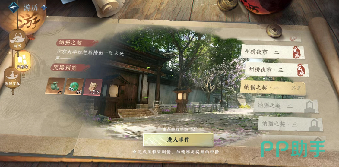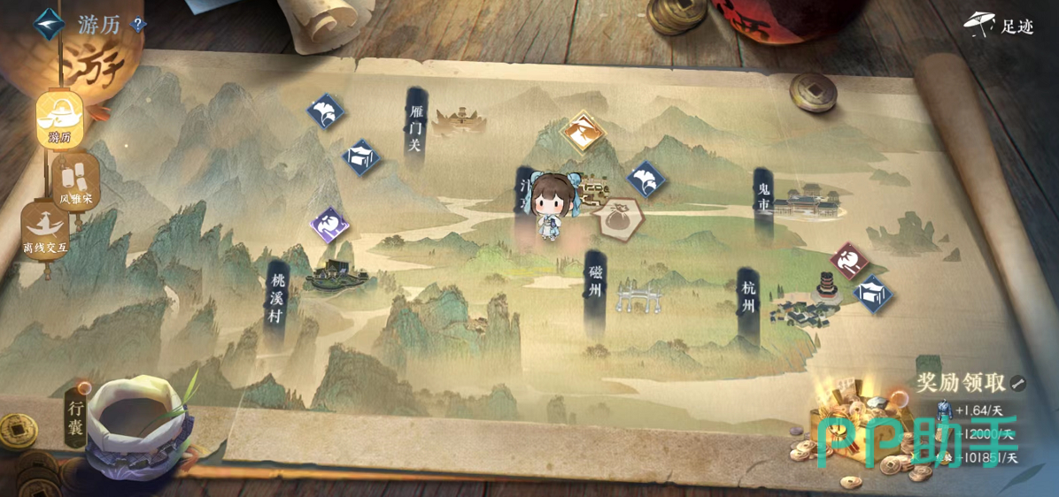 游历是一种趣味玩法,玩家们可以直接在菜单栏找到游历板块,点击进入之后,我们可以看到多个区域,在不同的区域,玩家们能够完成的任务都是不一样的,游历可以为我们解锁一定的交子、经验,还能帮助玩家获取更多的货币奖励。