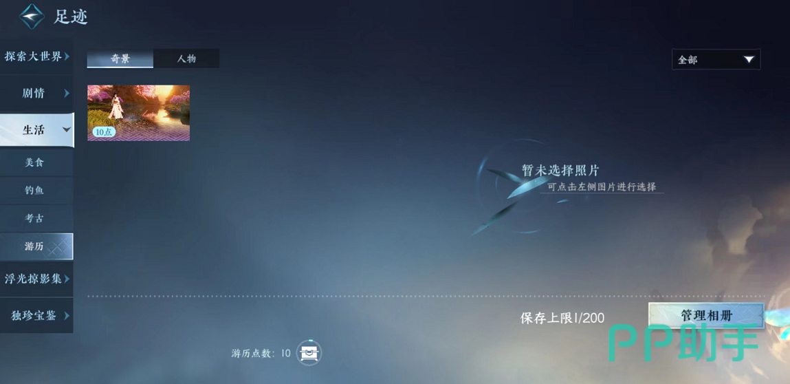 在足迹界面,玩家们还可以进行拍照。点击行囊可以装备一些材料,帮助玩家们在游历过程中应对各种特殊场景,而且游历还能为我们带来一些特殊的奇遇故事,这些都是很有趣的。