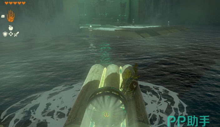东西拿走之后就可以启程前往终点了,整个水域面积还是很大的,但是一旦给木筏装上动力系统,跑起来就非常快了。在岸边是可以看到一个方形平台的,上面还有些小石柱装饰,一路划过去到达该位置,就可以完成这个部分的挑战了。