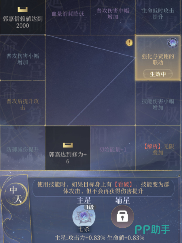 贾诩:首选半肉廉贞+天府,或者纯输出的太阴/七杀+天姚。替补太阳+巨门,廉贞/太阴+三台。同样建议没二星的贾诩选择半肉。